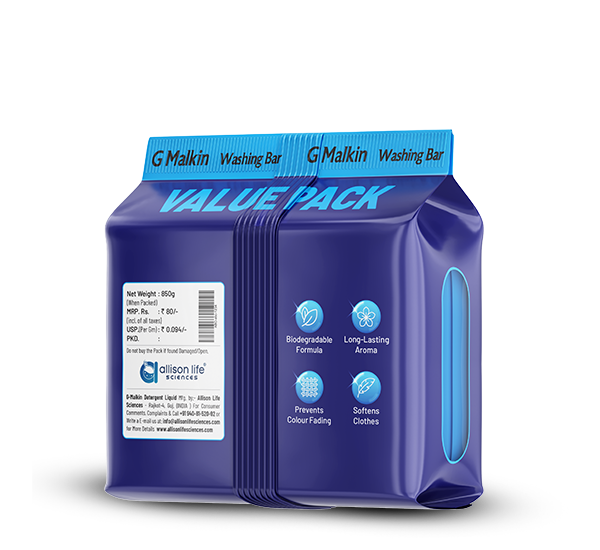 G malkin washing bar is most premium detergent bar and is developed with a unique formulation. G malkin washing bar combines the power of 3 products - brightener polymer and enzyme into just 1 product.thereby helping you fight and remove tough stains easily that help you save time.money and effort you put behind laundry. With just one product g malkin washing bar.you can easily remove tough stains like tea,coffee,turmeric,curry,ketchup and chocolate.g malkin washing bar is also available across other convenient pack sizes.